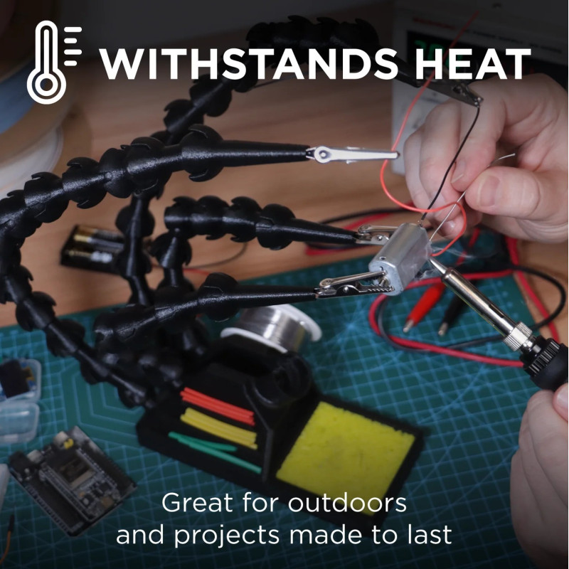 Армирование стекловолокном делает Polymaker™ HT-PLA-GF значительно жёстче и устойчивее к нагрузкам, чем обычный PLA. Детали, напечатанные из этого материала, сохраняют форму даже при температурах до 150°C, не деформируясь и не теряя прочности. Это идеальный выбор для создания функциональных и механически нагруженных компонентов, корпусов, оснастки и прочих изделий, требующих долговечности и стабильности.