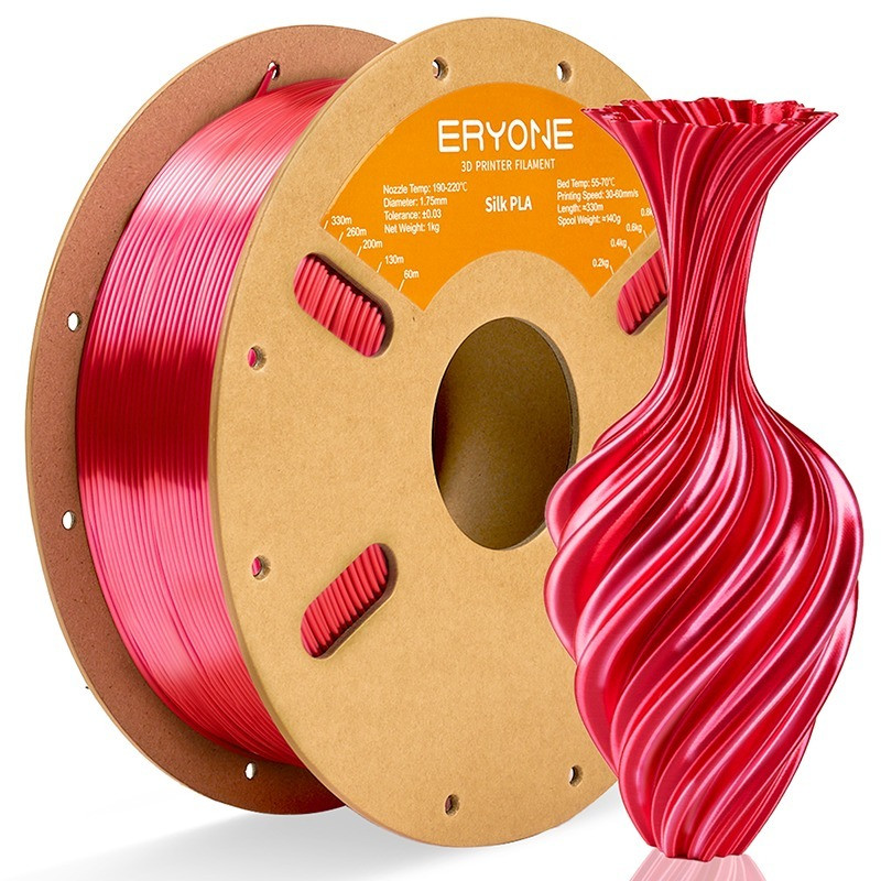 Eryone Silk PLA Metallic Fuchsia — высококачественный шёлковый филамент в металлическом керамическом розоватом цвете, который создаёт на готовых моделях потрясающий глянцевый эффект с шелковистой текстурой. Поверхность получается блестящей и гладкой, идеальной для декоративных изделий. Глянец можно регулировать: более высокая температура сопла или меньшая скорость печати усиливают блеск. Идеален для фигурок, ваз, ювелирных прототипов и объектов, где важна эстетика и премиальный вид.