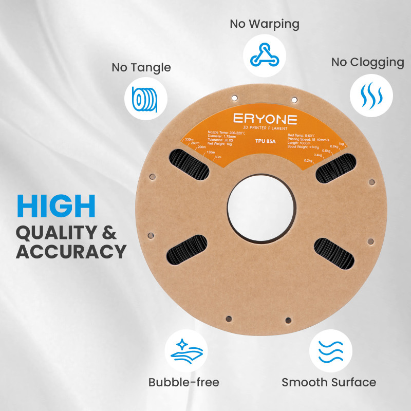 Eryone TPU 85A Solid Black — высококачественный гибкий филамент на основе TPU с твёрдостью 85A в классическом чёрном цвете. Значительно мягче, чем TPU 90A и 95A, обеспечивает превосходную эластичность, гладкое изгибание, растяжение и быстрое восстановление формы без деформации. Идеален для печати уплотнителей, прокладок, чехлов для телефонов, амортизирующих деталей, игрушек и любых изделий, требующих мягкости и долговечности.